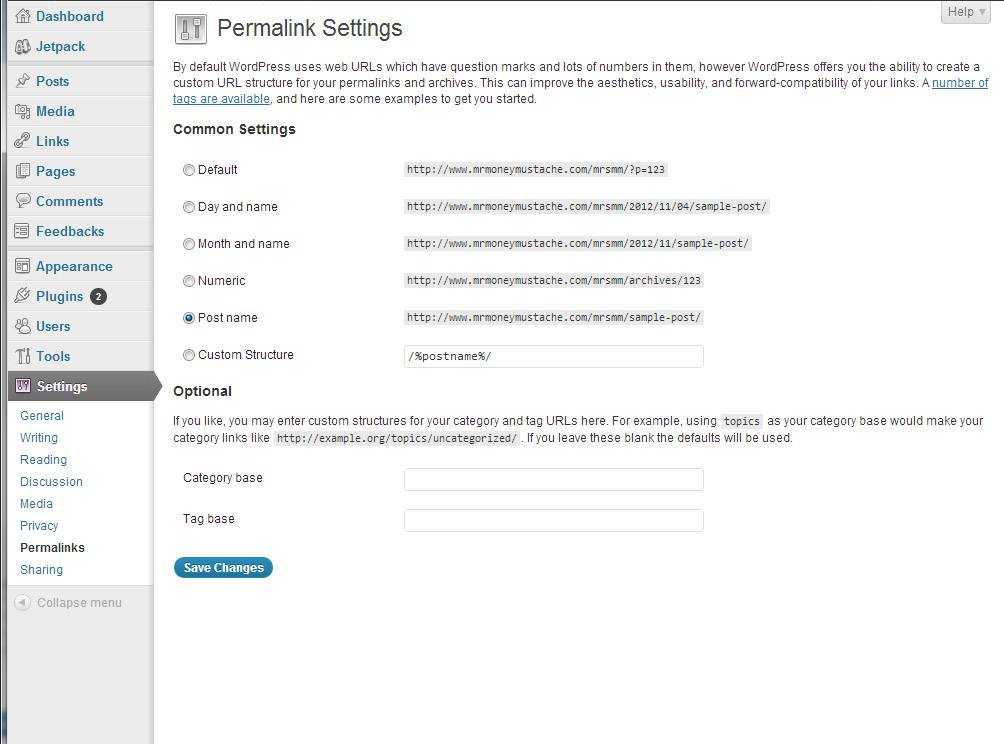 Advanced option: check out the ‘Permalink Settings’ to ensure the links to your articles URLs show up the way you’d like them to.  This will be handy when your catchiest articles later go viral on the Internet, as well as increasing the number of visitors you will get from search engines. The default of using Post Name seems pretty good, especially since an MMM reader friend of mine who is a Search Engine Optimization expert recommends leaving the date out of the permalink.