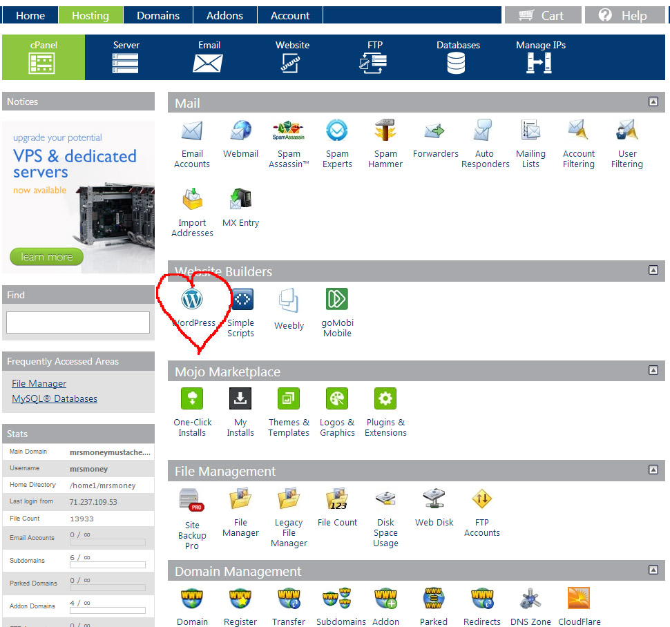 Your wordpress blog is up and running already!  You’ll now see the site in the “My Installs” section. Check it out by going to the URL (in my case: www.mrsmoneymustache.com/catchyfisherman) or login to the admin section of your site by clicking the green “Admin Login” button.