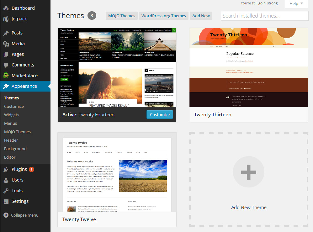 Step 1 – when you choose Appearance – Themes, you’ll see the theme that is currently installed on your site at the top left. The range of available themes is almost endless and people are making hundreds more even as you read. I also see that the Mojo Marketplace has been added as a convenient quicklink, which is a clever way to get you to buy one of their themes. I’m sure their themes are great, but start with something free and get to know your site before buying a theme.