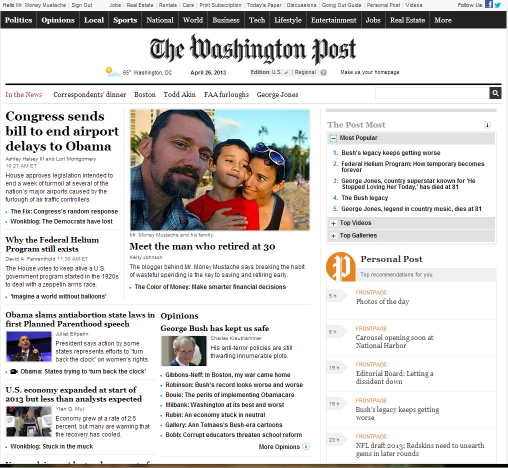 postIf you haven’t heard the news, it has been a pretty exciting weekend for Mustachianism. I had the rare treat of doing a little interview with the Washington Post, and it somehow got promoted to the front page of the paper’s online edition where it remained for the entire weekend. Even Ralph Nader retweeted it. This blog’s already ridiculous traffic doubled overnight, and so all of us old-timers would like to welcome the 50% of you who are brand-new!