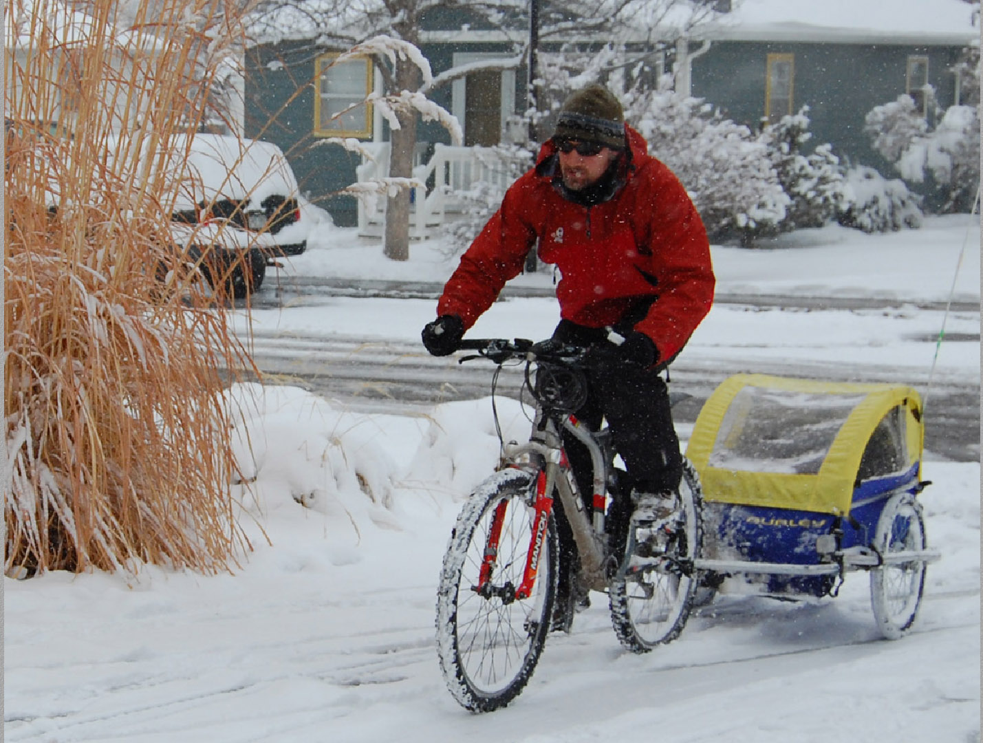 On the way home, I always cut through the park and ride along the creekside bike path. But halfway through, I discovered it had not been plowed, and the snow was getting deeper as I rode. I shifted down a gear and pedaled harder. The bike trailer’s narrow tires dug into the snowdrifts and presented increasing friction.