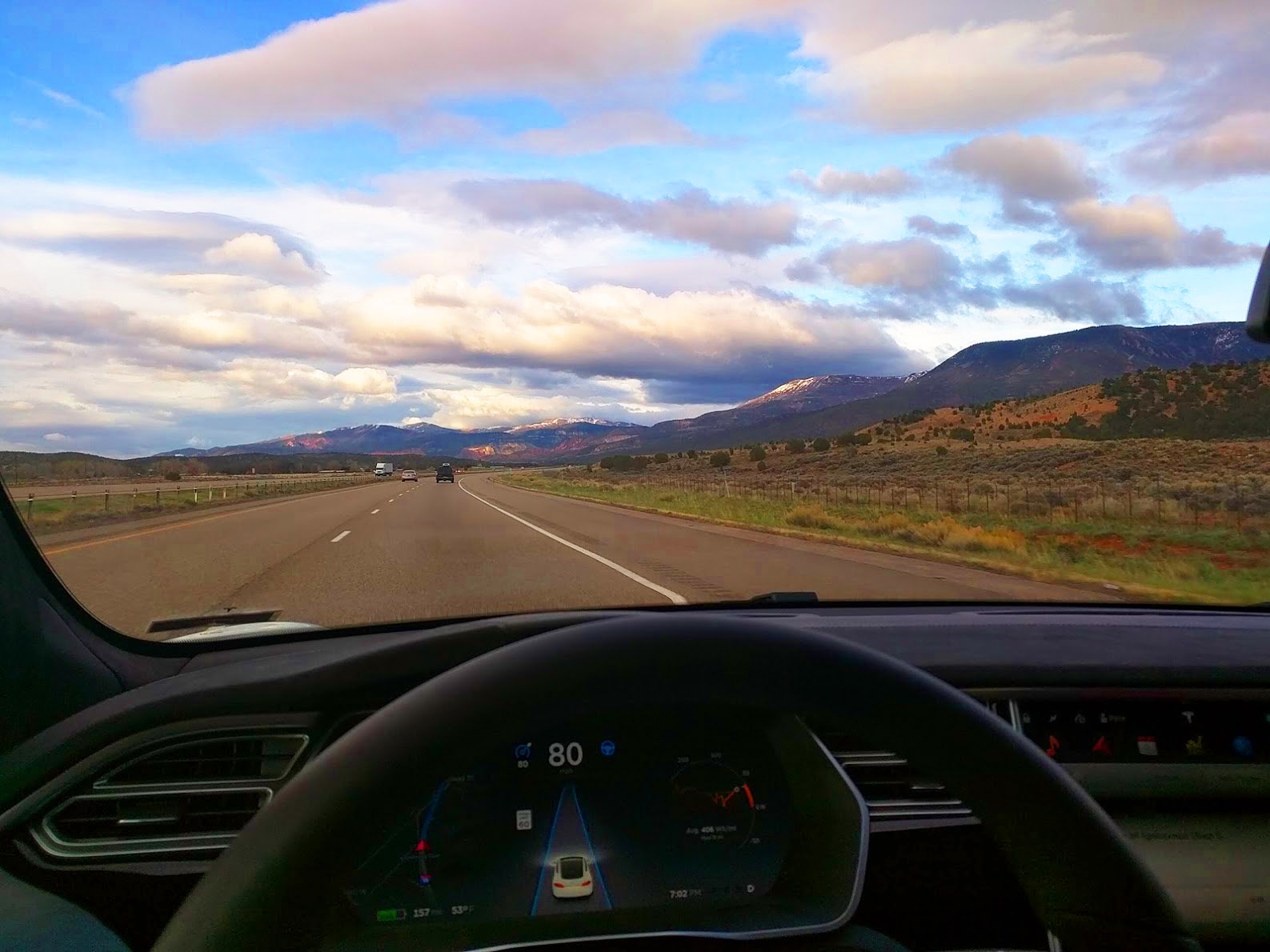 It already works pretty darned well from what I’ve seen. Although I enjoyed the effortless crossing of 600 miles of inland deserts and mountain ranges, the true joy came as we descended into the Los Angeles basin just in time for a Wednesday rush hour. With nearly perfect accuracy, Autopilot was able to glide me along through the endless traffic jams while I sat in the car’s open, airy, and incredibly quiet interior, streaming music from my phone into the car’s high-end audio system via Bluetooth, and enjoying conversation with my travel companions. It’s more like sitting in a rolling leather-appointed coffee shop than the buzzing, stressful driving experience we all grew up with. The windshield wipers detected a light rain and wiped it away as needed, and the headlights took care of illumination whenever they deemed it to be a little dark.