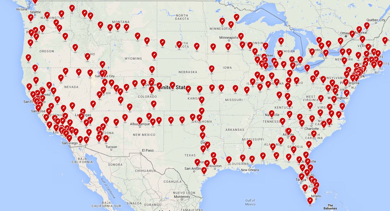 This is Tesla’s network of free charging stations as of April 2016. More are going in every day, but in a pinch you can always use one of the other 27,000 or so public electric car charging stations that have sprung up, or charge at home. For comparison there are 168k gas stations in this country.