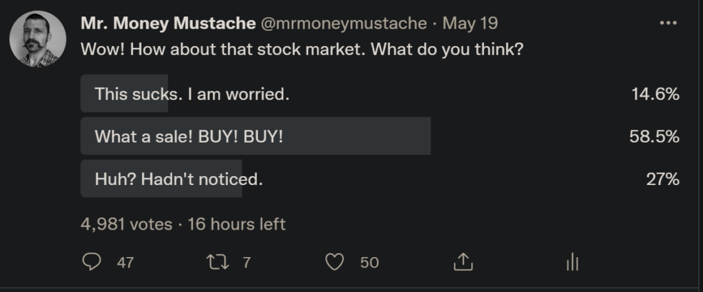Results of a recent Twitter poll – Mustachians are well ahead of average Americans, of whom only about 18% consider this a buying opportunity (!)