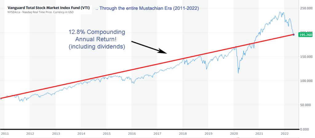 What if we decided to be more sensible, start the damned Y axis at zero as every graph should do, and zoom out to a reasonable time horizon,such as the Age of Mustachianism which happened to begin in 2011. And ignore the wiggly blue line and follow the more meaningful red line.