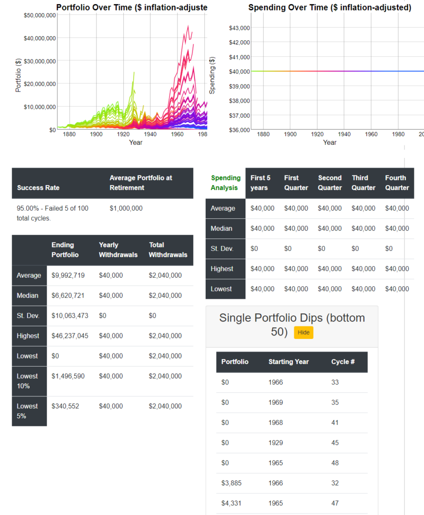 Assuming a small $1k boost from social security in my 60s, I’d have a 95% historical success rate. Only the Great Depression and the 1960s slump would have foiled this plan, and even then just barely.